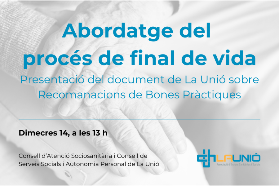Des del Consell d'Atenció Sociosanitària i des del Consell de Serveis Socials i Autonomia Personal de La Unió hem volgut aprofundir en l'Abordatge del Final de Vida. En aquest sentit es va crear un grup nuclear multidisciplinari de professionals experts que han treballat un document de recomanacions de bones pràctiques. Més d'un centenar de professionals de les nostres entitats associades, han participat en una enquesta per tal de conèixer quina és la situació actual i quina volem que sigui en un futur en els diferents àmbits assistencials.